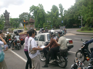 Selesai konferensi pers anggota Kolaborasi Bali untuk Perubahan Iklim kemudian melakukan kampanye publik dengan membagikan flier dan stiker kampanye di perempatan Catur Muka Denpasar.