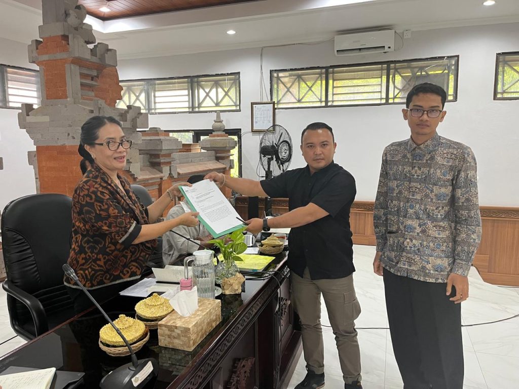 Selanjutnya, Surat tanggapan WALHI Bali mengenai proyek ini diserahkan oleh Made Krisna Bokis Dinata, S.Pd., M.Pd. bersama Ida Bagus Arya Yoga Bharata, S.Pd. dan diterima oleh Ir. Ida Ayu Dewi Putri Ary, ST., M.Si. selaku pimpinan rapat yang mewakili Dinas Kehutanan dan Lingkungan Hidup Provinsi Bali.